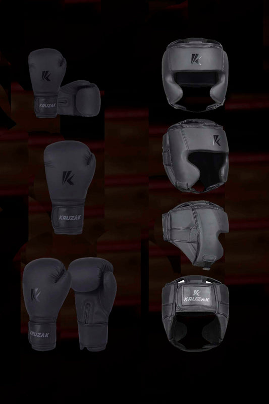 Matte-Black Boxing Gloves and Head Guard Set